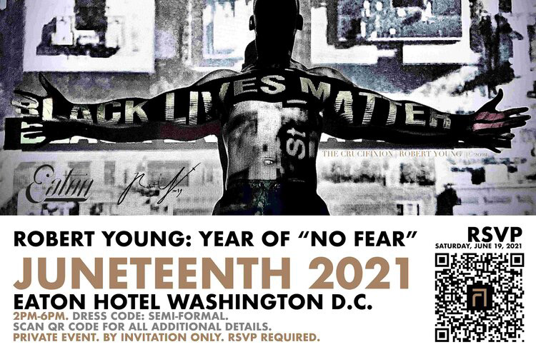On the 156th anniversary of Juneteenth, Robert Young presented a celebration of gratitude for Washington DC., a place that has provided him with the opportunity to continue to deliver large-scale Public Art Activations, even in the heart of the pandemic. The event was one of the first indoor mask-free events since the Pandemc began.